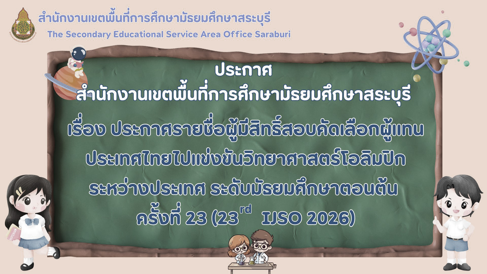 ข่าวประชาสัมพันธ์ ประกาศ-รับสมัคร-แต่งตั้ง ประกาศรายชื่อผู้มีสิทธิ์สอบคัดเลือกผู้แทนประเทศไทยไปแข่งขันวิทยาศาสตร์โอลิมปิกระหว่างประเทศ ระดับมัธยมศึกษาตอนต้นครั้งที่ 23 (23rd IJSO 2026) 09/01/202609/01/2026 admin_sri IJSO-2026Download
