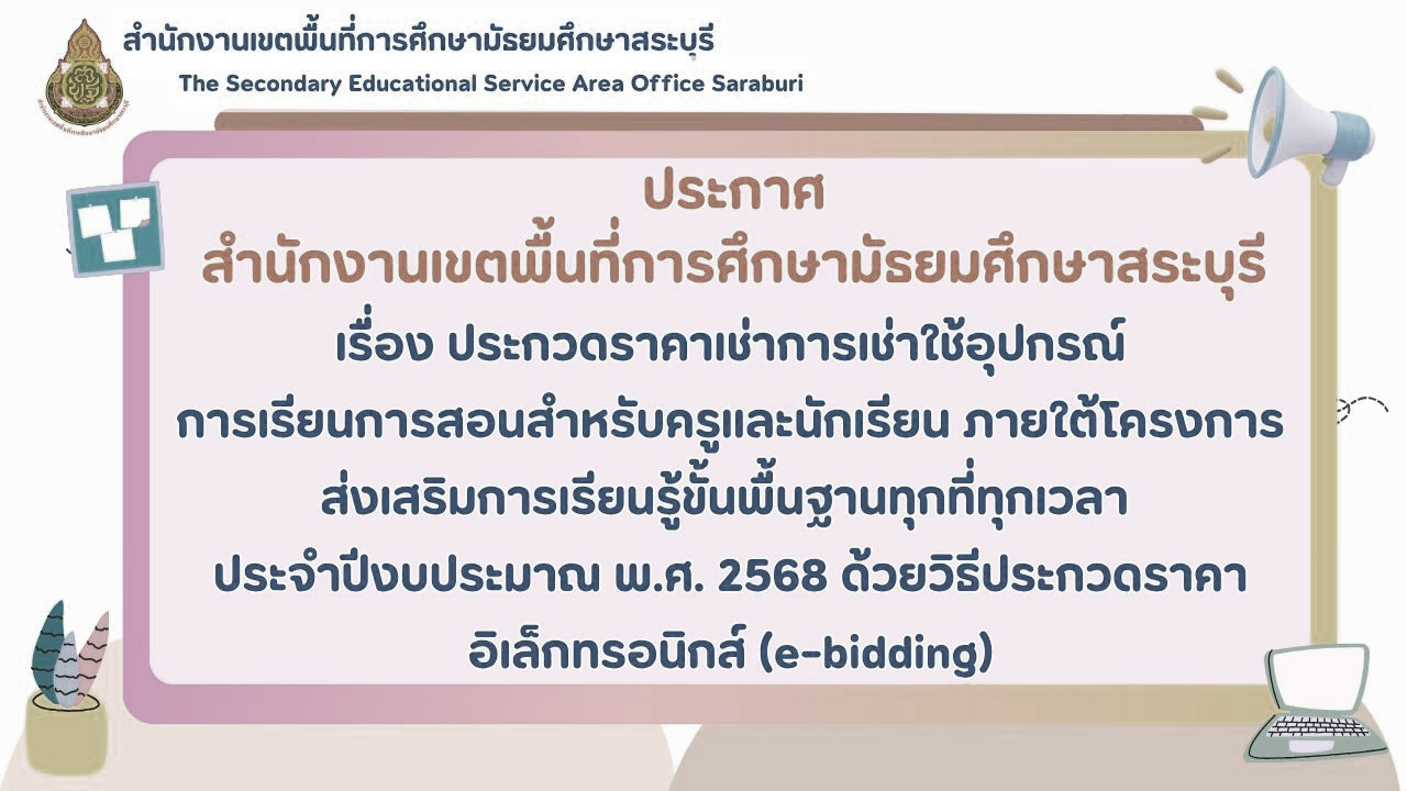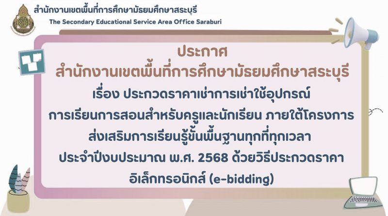 เรื่อง ประกวดราคาเช่าการเช่าใช้อุปกรณ์การเรียนการสอนสำหรับครูและนักเรียน ภายใต้โครงการส่งเสริมการเรียนรู้ขั้นพื้นฐานทุกที่ทุกเวลา ประจำปีงบประมาณ พ.ศ. 2568 ด้วยวิธีประกวดราคาอิเล็กทรอนิกส์ (e-bidding)