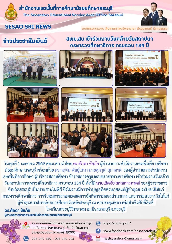 วันพุธที่ 1 เมษายน 2569 สพม.สบ นำโดย ดร.ศักดา ชัยภัย ผู้อำนวยการสำนักงานเขตพื้นที่การศึกษามัธยมศึกษาสระบุรี พร้อมด้วย ดร.กฤติน พันธุ์เสนา นายศุภวุฒิ สุภาชาติ รองผู้อำนวยการสำนักงานเขตพื้นที่การศึกษา ผู้บริหารสถานศึกษา ข้าราชการครูและบุคลากรทางการศึกษา เข้าร่วมงานวันคล้ายวันสถาปนากระทรวงศึกษาธิการ ครบรอบ 134 ปี ทั้งนี้มี นายเลิศชัย สกลเสาวภาคย์ รองผู้ว่าราชการจังหวัดสระบุรี เป็นประธานในพิธี ซึ่งในงานมีการทำบุญอุทิศส่วนกุศลแก่ผู้ทำคุณประโยชน์ให้แก่กระทรวงศึกษาธิการ การรับชมการถ่ายทอดสดการจัดกิจกรรมของส่วนกลาง และการมอบรางวัลให้แก่ผู้ทำคุณประโยชน์ต่อการศึกษาจังหวัดสระบุรี ณ หอประชุมหลวงพ่อสำเร็จศักดิ์สิทธิ์ โรงเรียนสระบุรีวิทยาคม อ.เมืองสระบุรี จ.สระบุรี