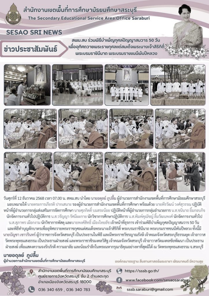 วันศุกร์ที่ 12 ธันวาคม 2568 เวลา 07.00 น. สพม.สบ นำโดย นายอดุลย์ ภูปลื้ม ผู้อำนวยการสำนักงานเขตพื้นที่การศึกษามัธยมศึกษาสระบุรี มอบหมายให้ นายตระการเกียรติ ปากเสนาะ รองผู้อำนวยการสำนักงานเขตพื้นที่การศึกษา พร้อมด้วย นายพีรวัฒน์ วงศ์สุวรรณ ปฏิบัติหน้าที่ผู้อำนวยการกลุ่มส่งเสริมการจัดการศึกษา นายศุภกิตติ์ บมสระน้อย ปฏิบัติหน้าที่ผู้อำนวยการกลุ่มอำนวยการ น.ส.ชนินาถ ยิ้มกอบกิจ นักจัดการงานทั่วไปปฏิบัติการ น.ส.วรัญญา รัศมีผะกาย นักวิชาการศึกษาปฏิบัติการ น.ส.พิมพ์คุณัชญ์ ลิ้มวัฒนพงศ์ นักจัดการงานทั่วไป น.ส.สุภาพร เผือกงาม นักวิชาการพัสดุ และนายพงศ์สิทธิ์ เมืองไทยธัช เจ้าหน้าที่ธุรการ เข้าร่วมพิธีบำเพ็ญกุศลปัญญาสมวาร 50 วัน และพิธีทำบุญตักบาตรเพื่ออุทิศถวายพระราชกุศลแด่สมเด็จพระนางเจ้าสิริกิติ์ พระบรมราชินีนาถ พระบรมราชชนนีพันปีหลวง ทั้งนี้มีนายบัญชา เชาวรินทร์ ผู้ว่าราชการจังหวัดสระบุรี เป็นประธานในพิธี และมีพระราชวัชรญาณรังษี เจ้าคณะจังหวัดสระบุรีธรรมยุต เจ้าอาวาสวัดพระพุทธแสงธรรม เป็นประธานฝ่ายสงฆ์ และพระราชวชิรมงคลวิสิฐ เจ้าคณะจังหวัดสระบุรี เจ้าอาวาสวัดมงคลชัยพัฒนา เป็นประธานฝ่ายสงฆ์ เพื่อแสดงความจงรักภักดี ความอาลัย และน้อมรำลึกในพระมหากรุณาธิคุณอย่างหาที่สุดมิได้ ณ วัดพระพุทธแสงธรรม อำเภอหนองแค จังหวัดสระบุรี