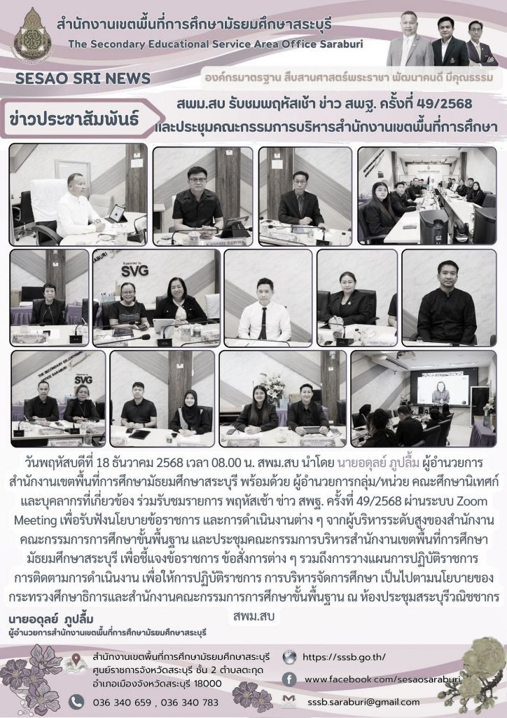 วันพฤหัสบดีที่ 18 ธันวาคม 2568 เวลา 08.00 น. สพม.สบ นำโดย นายอดุลย์ ภูปลื้ม ผู้อำนวยการสำนักงานเขตพื้นที่การศึกษามัธยมศึกษาสระบุรี พร้อมด้วย ผู้อำนวยการกลุ่ม/หน่วย คณะศึกษานิเทศก์ และบุคลากรที่เกี่ยวข้อง ร่วมรับชมรายการ พฤหัสเช้า ข่าว สพฐ. ครั้งที่ 49/2568 ผ่านระบบ Zoom Meeting เพื่อรับฟังนโยบายข้อราชการ และการดำเนินงานต่าง ๆ จากผู้บริหารระดับสูงของสำนักงานคณะกรรมการการศึกษาขั้นพื้นฐาน และประชุมคณะกรรมการบริหารสำนักงานเขตพื้นที่การศึกษามัธยมศึกษาสระบุรี เพื่อชี้แจงข้อราชการ ข้อสั่งการต่าง ๆ รวมถึงการวางแผนการปฏิบัติราชการ การติดตามการดำเนินงาน เพื่อให้การปฏิบัติราชการ การบริหารจัดการศึกษา เป็นไปตามนโยบายของกระทรวงศึกษาธิการและสำนักงานคณะกรรมการการศึกษาขั้นพื้นฐาน ณ ห้องประชุมสระบุรีวณิชชากร สพม.สบ