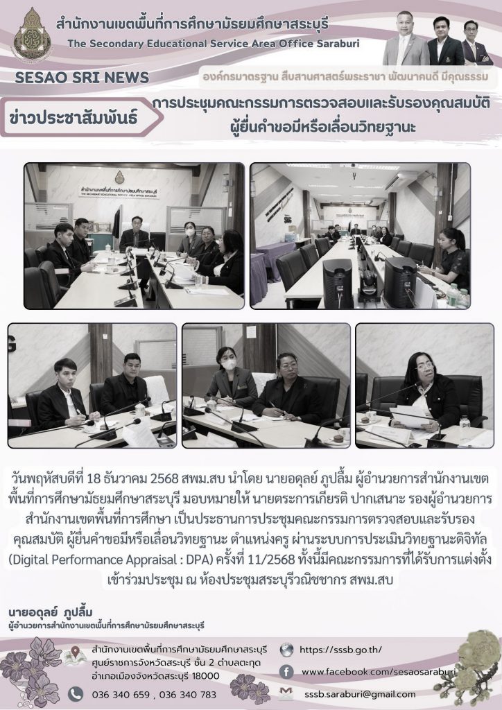 วันพฤหัสบดีที่ 18 ธันวาคม 2568 สพม.สบ นำโดย นายอดุลย์ ภูปลื้ม ผู้อำนวยการสำนักงานเขตพื้นที่การศึกษามัธยมศึกษาสระบุรี มอบหมายให้ นายตระการเกียรติ ปากเสนาะ รองผู้อำนวยการสำนักงานเขตพื้นที่การศึกษา เป็นประธานการประชุมคณะกรรมการตรวจสอบและรับรองคุณสมบัติ ผู้ยื่นคำขอมีหรือเลื่อนวิทยฐานะ ตำแหน่งครู ผ่านระบบการประเมินวิทยฐานะดิจิทัล (Digital Performance Appraisal : DPA) ครั้งที่ 11/2568 ทั้งนี้มีคณะกรรมการที่ได้รับการแต่งตั้งเข้าร่วมประชุม ณ ห้องประชุมสระบุรีวณิชชากร สพม.สบ