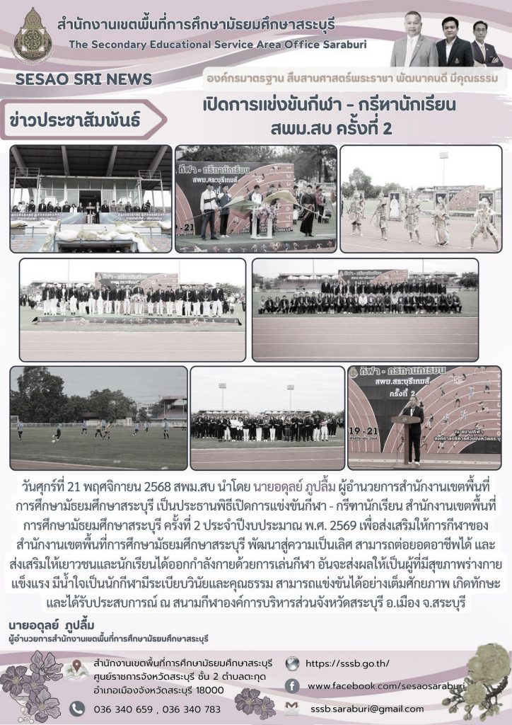 วันศุกร์ที่ 21 พฤศจิกายน 2568 สพม.สบ นำโดย นายอดุลย์ ภูปลื้ม ผู้อำนวยการสำนักงานเขตพื้นที่การศึกษามัธยมศึกษาสระบุรี เป็นประธานพิธีเปิดการแข่งขันกีฬา – กรีฑานักเรียน สำนักงานเขตพื้นที่การศึกษามัธยมศึกษาสระบุรี ครั้งที่ 2 ประจำปีงบประมาณ พ.ศ. 2569 เพื่อส่งเสริมให้การกีฬาของสำนักงานเขตพื้นที่การศึกษามัธยมศึกษาสระบุรี พัฒนาสู่ความเป็นเลิศ สามารถต่อยอดอาชีพได้ และส่งเสริมให้เยาวชนและนักเรียนได้ออกกำลังกายด้วยการเล่นกีฬา อันจะส่งผลให้เป็นผู้ที่มีสุขภาพร่างกายแข็งแรง มีน้ำใจเป็นนักกีฬามีระเบียบวินัยและคุณธรรม สามารถแข่งขันได้อย่างเต็มศักยภาพ เกิดทักษะและได้รับประสบการณ์ ณ สนามกีฬาองค์การบริหารส่วนจังหวัดสระบุรี อ.เมือง จ.สระบุรี