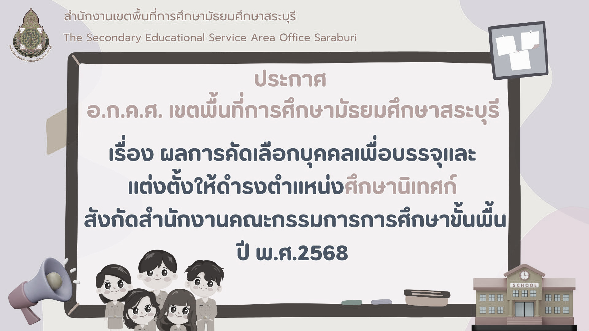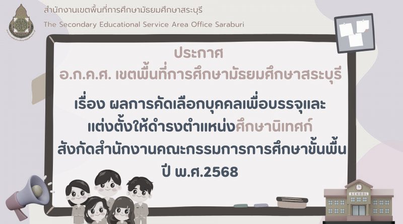 ข่าวประชาสัมพันธ์ ประกาศ-รับสมัคร-แต่งตั้ง เรื่อง ผลการคัดเลือกบุคคลเพื่อบรรจุและแต่งตั้งให้ดำรงตำแหน่งศึกษานิเทศก์ สังกัด สพฐ. ปี พ.ศ. 2568 19/12/202519/12/2025 admin_sri ผลการคัดเลือก-ศนDownload